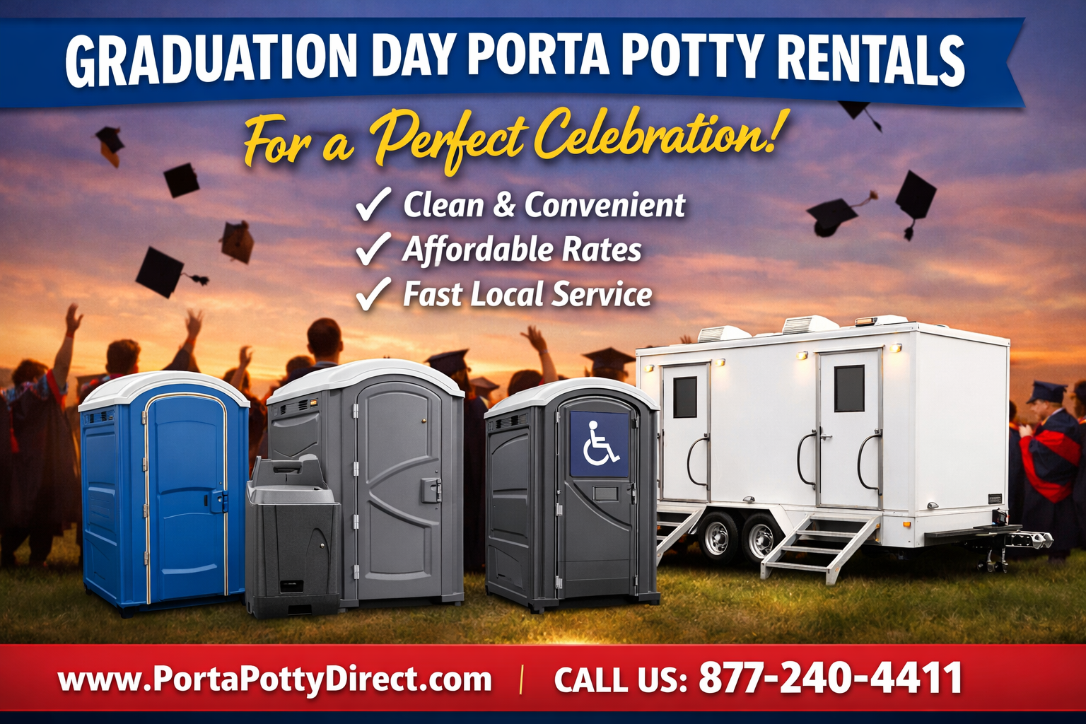 Celebrate graduation comfortably with professional porta potty rentals near you. Perfect for backyard parties, school ceremonies, and large events. Call 877-240-4411.