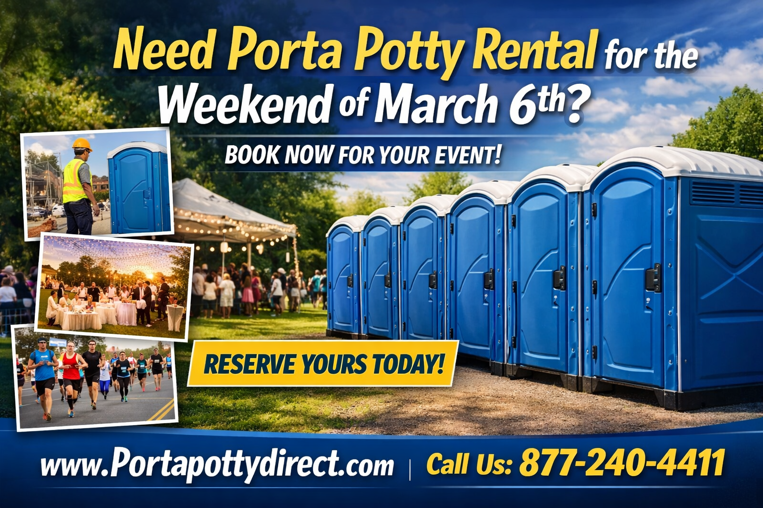 Rent porta potties for the March 6th weekend. Affordable portable restroom rentals for events, festivals, and job sites. Visit www.portapottydirect.com or call 877-240-4411.